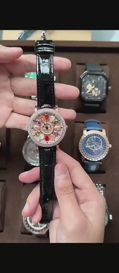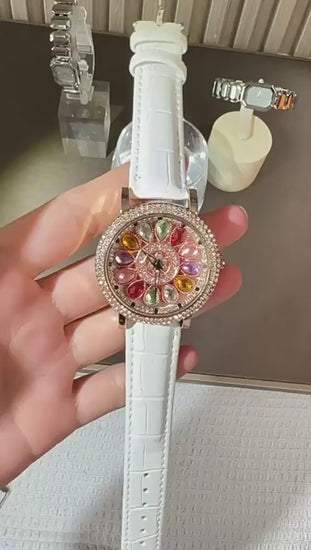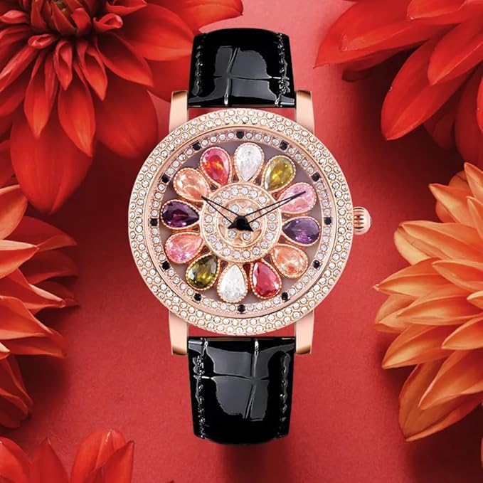 Introducing the LYNZ Floral Analog Watch – a fusion of style, elegance, and innovation designed especially for today’s modern woman. This beautifully crafted women's watch is more than a timepiece; it’s a statement of sophistication and grace. The eye-catching feature is its rotating floral dial, adorned with multicolor diamond accents that sparkle with movement, capturing attention and admiration wherever you go.